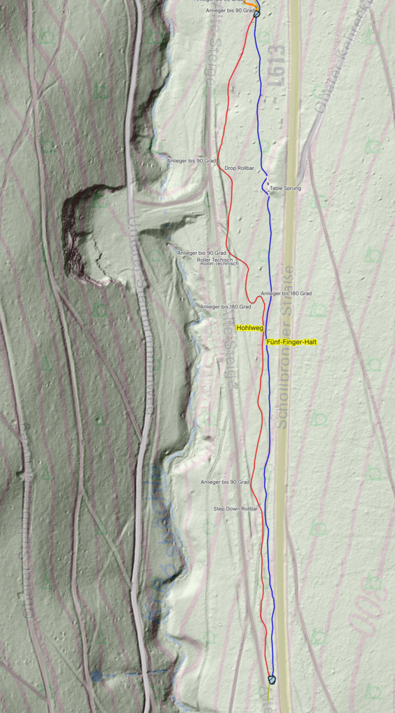 Der Abschnitt Hohlweg ist von mehreren Geländeeinschnitten geprägt. Der Trail taucht dreimal in einen alten Hohlweg ein und wieder aus. Die Einfahrten sind fahrtechnisch anspruchsvoll – steil und mit Side Hits, über die man auch einspringen kann. Zwischen den drei Wechseln ist die Strecke relativ flach, teils sogar leicht ansteigend – hier gilt es, den Schwung klug mitzunehmen.
